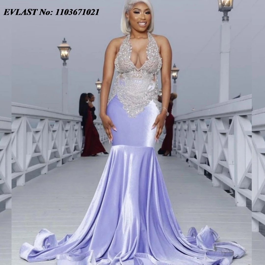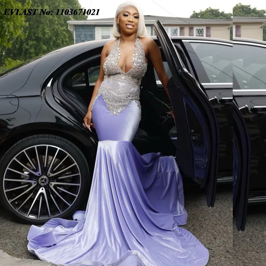 This stunning lavender prom dress is crafted with luxurious velvet and adorned with sparkling sequins and crystal beads, making it a true showstopper. The dress is available in a beautiful lavender color, a perfect choice for a refined, elegant appearance. The lavender color prom dresses feature a flattering halter neckline and a sleeveless design, providing a graceful silhouette that complements every figure. This dress has a floor-length style that is perfect for those looking to make a bold statement at their prom or any formal evening event.