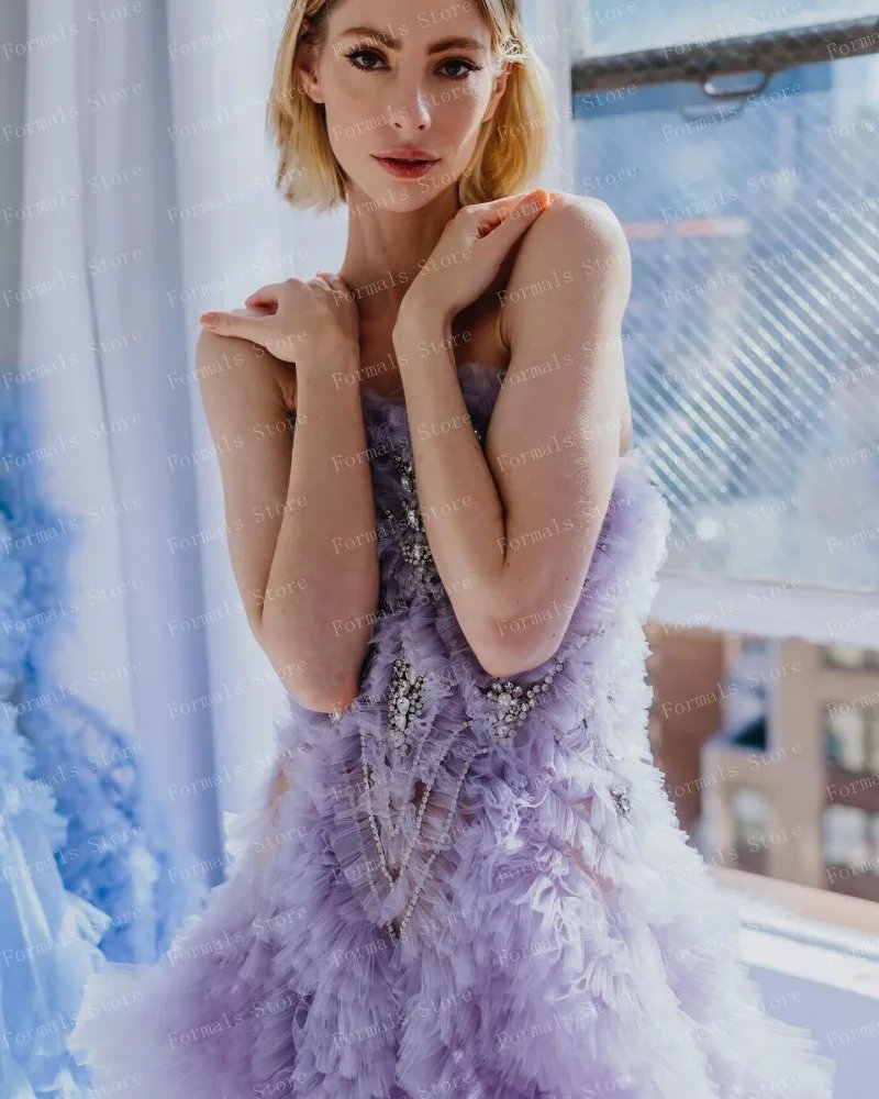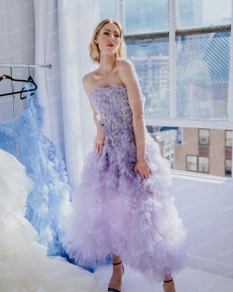 This lavender prom dress will make you feel confident and graceful. It’s a versatile gown that can be worn to various occasions such as prom, evening events, weddings, homecomings, or quinceañeras. Featuring a strapless sweetheart neckline and ruffled tulle midi skirt, it adds an air of sophistication while the dazzling crystal accents catch the light beautifully. The lavender color prom dresses provide a soft, feminine hue, ensuring you stand out with class and style. This dress is truly designed to make you shine during your most special celebrations.